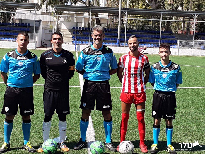 שני הקפטנים, לירן גוטמן ויוסי נקש, עם צוות השיפוט לפני המשחק. גוטמן הוא הרבה מעבר לקפטן ביהוד. צילום: אלי שמואלי.