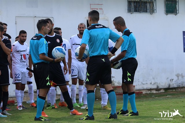 שחקני הקבוצות והשופטים בתחילת המשחק (צילום: עודד חסין)