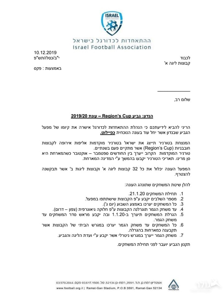 מחר, 21.1.2020, יחל מפעל גביע נוסף כפיילוט - REGIONS CUP. במפעל ייקחו חלק כל קבוצות ליגה א' צפון ודרום, כאשר קבוצות ליגה ב' שתבקשנה לקחת חלק במפעל. משחקי המפעל ישוחקו בימי שלישי כשמספר השלבים ייקבע ע"פ מספר הקבוצות שישתתפו במפעל כשעד לשלב הגמר המשחקים יוגרלו לפי חלוקה גיאוגרפית - צפון ודרום.