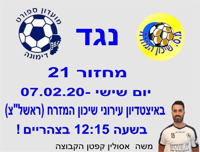 משחק העונה בליגה ב' דרום ב' יפגיש בין שיכון המזרח שתופסת את המקום ה-3 בטבלה, למוליכה מ.ס דימונה כשבין הקבוצות מפרידות שש נקודות. קבוצתו של שמעון ביטון תגיע להילחם על המגרש במשחק לא פשוט, במטרה להמשיך את רצף הניצחונות, ואילו שיכון המזרח שלה יתרון הביתיות לא תעשה לה חיים קלים.