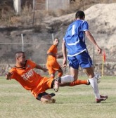 ניר חזות(בכחול),ודודו אזולאי מהקריה מחפשים כדור.(צילום:רועי אסרף)
