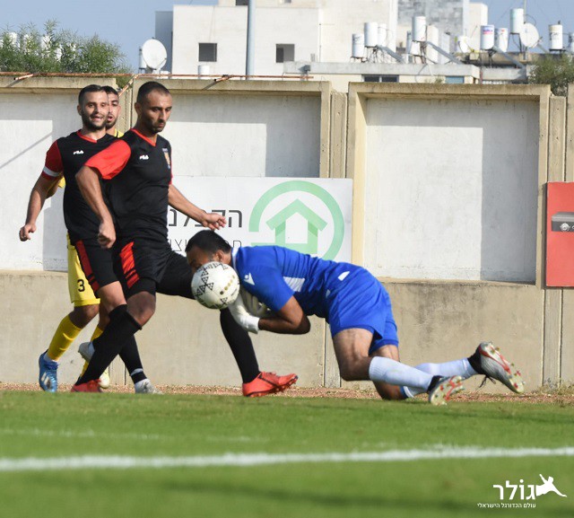 אבי איבגי שוער של הרצליה מנסה להדוף כדור (צילום: מני בן ארי)