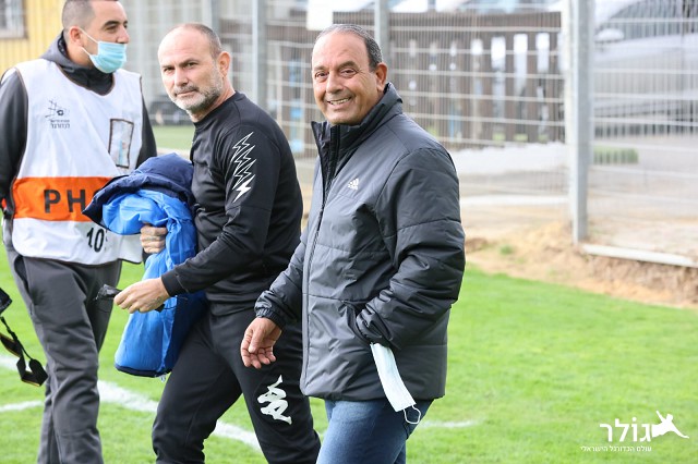 חיים לוי, מאמן מגדל העמק ומוטי איווניר מאום אל פאחם שמח לאחר הניצחון (צילום - חגאג רחאל)