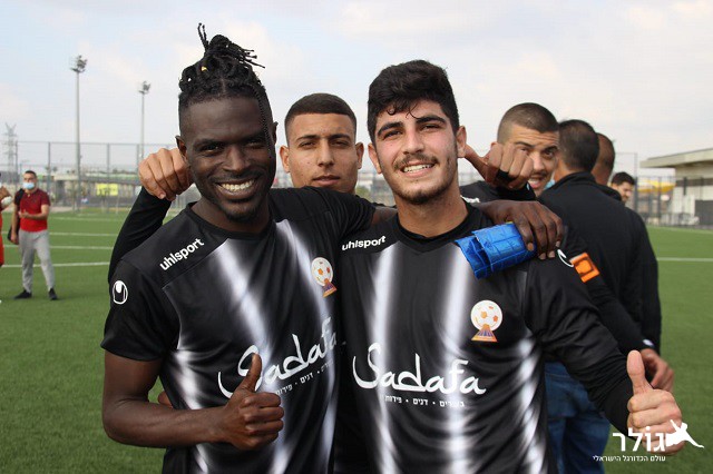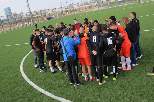 שחקני כסייפה ומאמנם אמיר כהן בסיום (צילום: עמוד הפייסבוק עירוני כסייפה)