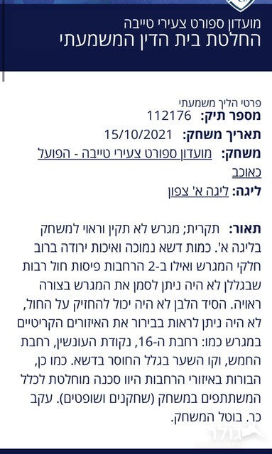 - לא מקובל לתת טכני על מגרש לא תקין לא מידתי ולא צודק (דני 20-10-2021, 22:05)יכולים לפסוק שטייבה תפצה על ההוצאות של כוכאב עקב ההגעה ...כנראה בהתאחדות עושים כסף מאגרת ערעור מיותר מרושע וטיפשי..