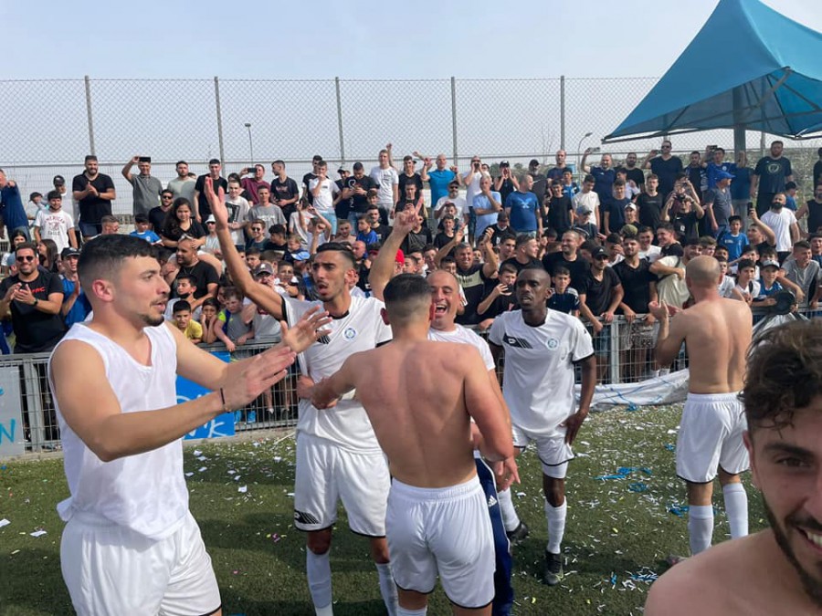 שחקני עירוני מודיעין חוגגים עליה היסטורית לליגה א'. צילום: עירוני מודיעין