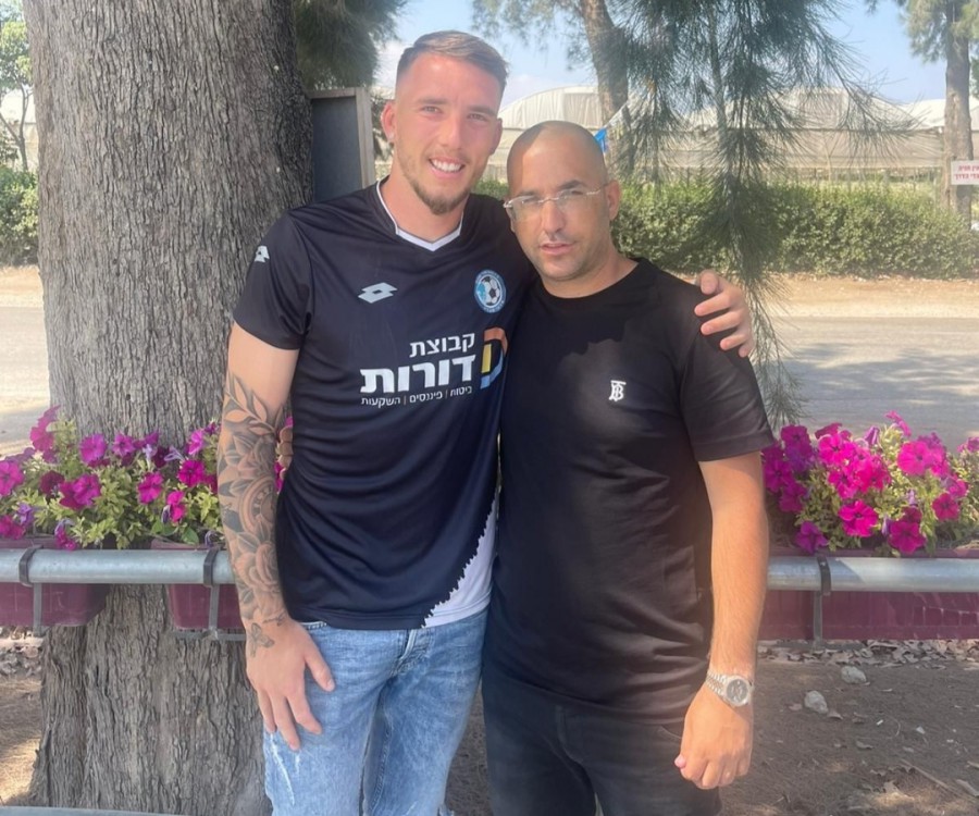 תומר וסוכנו רועי סימוני מיד לאחר החתימה על החוזה בטבריה.