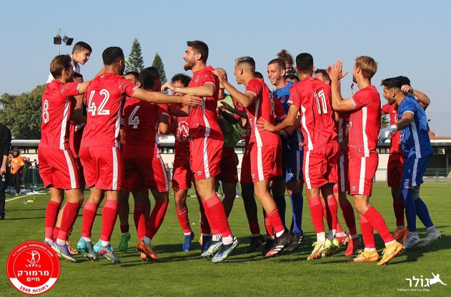 שחקני מרמורק לאחר הניצחון הענק של קבוצתו על מכבי יבנה החזקה. צילום: דוברות מרמורק