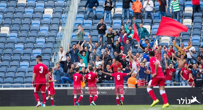 שחקני אום אל פאחם חוגגים. ינצחו את הפועל ר"ג ? צילום: אדיר נמרוד כץ