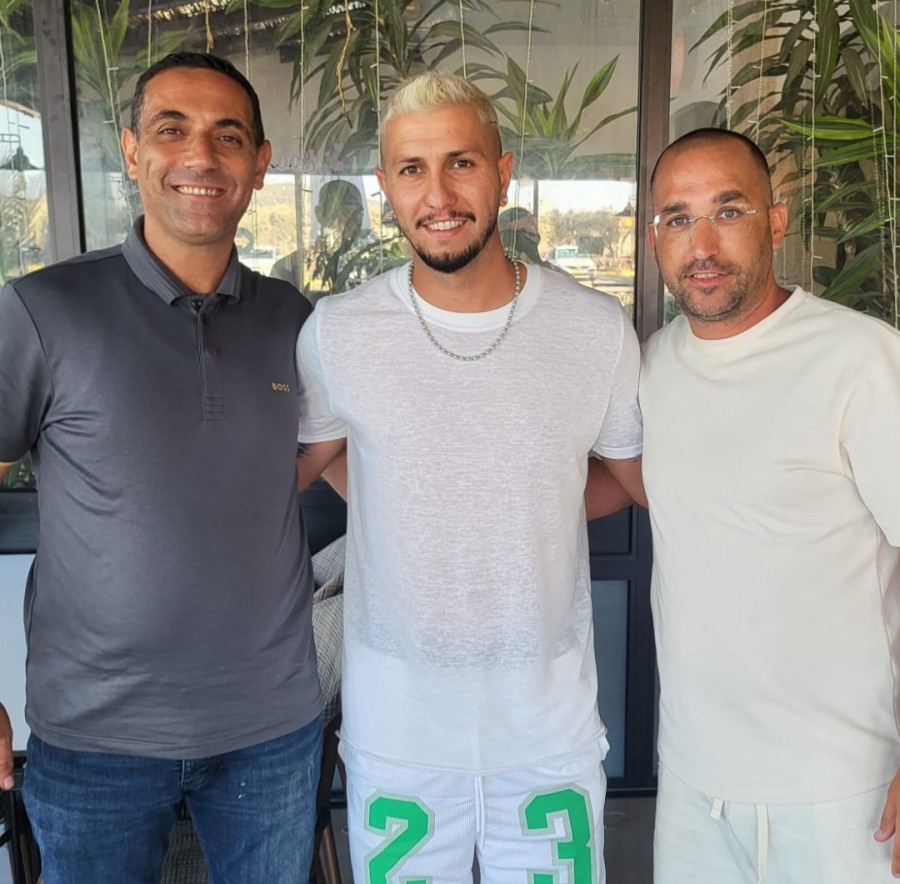 חן ידען וסוכנו רועי סימוני מיד לאחר החתימה על החוזה בכפר כנא.