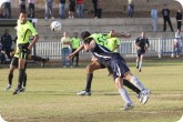 מוטי שורש נוגח את הכדור פנימה . טל בניש לא יכול לעצור (צילום: ניר חורי)