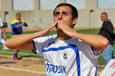 שחקני לוד חוגגים, כפיר מלול לא מאמין שככה זה נגמר, היום בחולון (צילום: גיא חזקיהו).