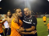 שחקני כפר קאסם מודים לאוהדים ואורח מיוחד בא לברך אותם. (צילום:שלמה אשר-חיים)