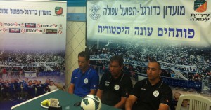 תומר רחמים,ירון הוכנבוים וגוני טננבוים במסיבת העיתונאים.(צילום:דוברות הפועל עפולה,כפיר בזק.)