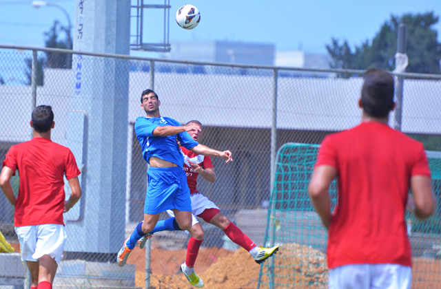 מאור לובין במאבק אוירי עם הגנת הרצליה.(צילום:רמי גרידיש)