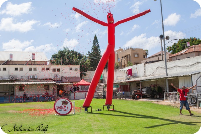 אוהדי מרמורק מציגים בובה מתנפחת עם הלוגו החדש של הקבוצה.(צילום:רפי נחמיאס)