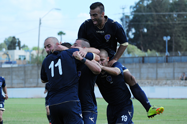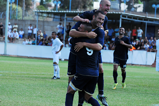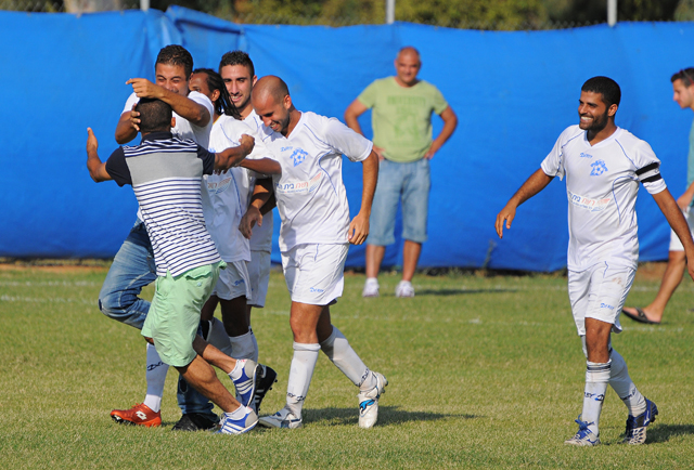 שחקני הבאר חוגגים את השער. (צילום: רמי גרידיש)