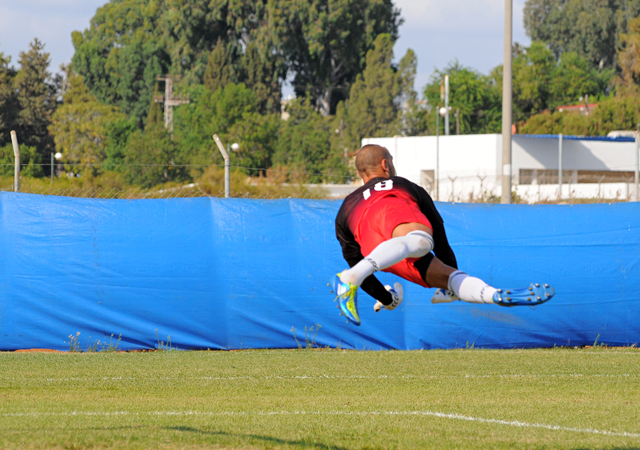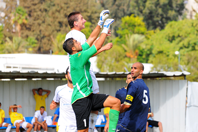 אלירן סולימנפור, עולה לכדור גובה. עמד בשער נפלא ועשה את עבודתו. (צילום: רמי גרידיש)