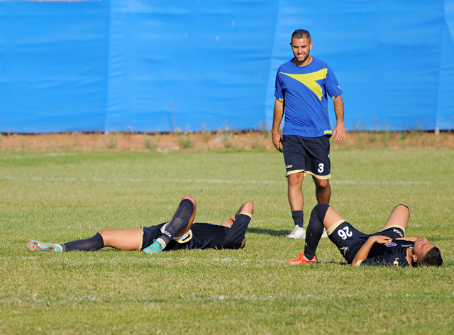 שחקני באר יעקב, שרועים על הדשא. (צילום: רמי גרידיש)