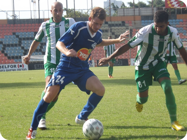 רבינוביץ שומר על הכדור מפני, ציציאק נאור ואייל שן. (צילום: אביחי חיים)