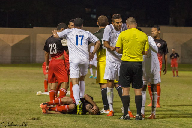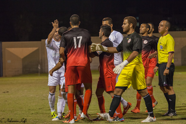 בלילי מתעמת עם שחקני מרמורק לאחר הצהוב הראשון.(צילום:רפי נחמיאס)