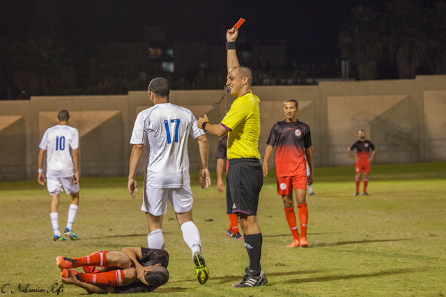 טל קפלן מניף לבלילי את הכרטיס האדום.(צילום:רפי נחמיאס)