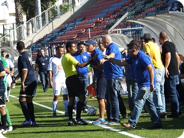 משחק כדורגל לא היה היום בשכונת התקווה זאת ראו כולם, אך מהומה גדולה בהחלט הייתה. זה התחיל לקראת סוף המחצית הראשונה. יוסי עמר ניסה להתגרות בספסל היפואי, כאשר לקח בקבוק מים מתחת לרגליו של אילן אלפסי שלא אהב את ההתנהגות ולקח ממנו את הבקבוק, עמר התעקש ומכאן החלה המהומה. עמר בעט ברגלו של אלפסי ושלח לו מרפק לפרצוף. השופט, שלא ראה את המכה לא הרחיק את עמר והרחיק את אלפסי מספסל הקבוצה היישר ליציע לאחר כמה דקות של חוסר סדר במגרש. עמר זרק לעברו של אלפסי את המילה "מניאק", אלפסי יצא מתחומי המגרש להירגע ביציע מאחורי השער. השופט סגר את "הפארסה" מספר שניות לאחר מכן ושרק למחצית.