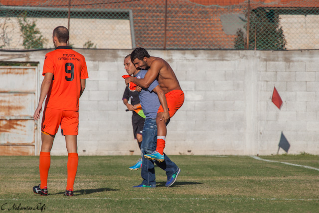 שחקני הכפר מנסים לעצור את אבאי ארדני. (צילום: רפי נחמיאס)