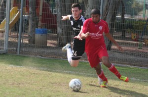 מחנה מול יפו. גל יער (עם הגב) מול סלמה מנע מיפו. הקבוצה מליגה ב' עמדה בכבוד