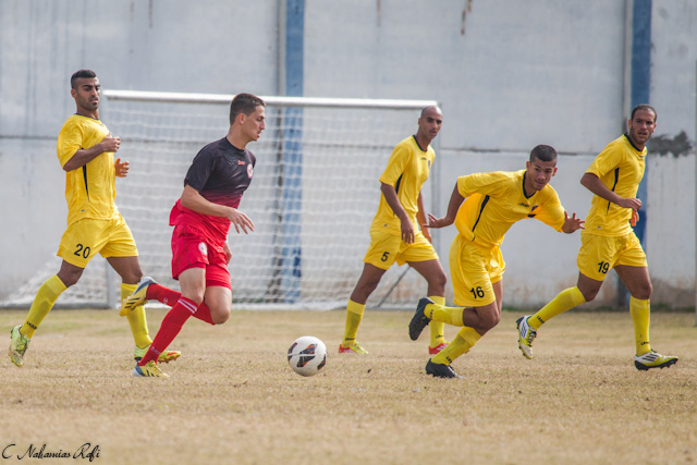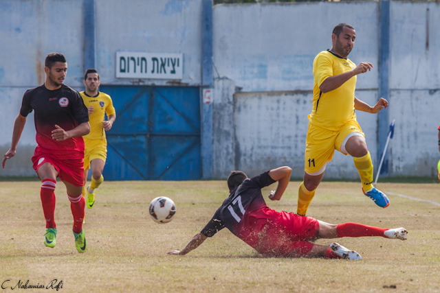 אלקבץ גולש לעברו של מגול. ההגנה של מרמורק בלתי חדירה.( צילום: רפי נחמיאס)