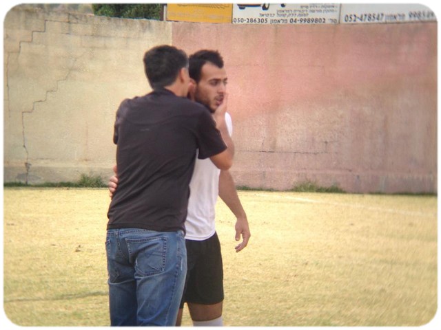 ניסים אדרי נותן נשיקה לחוסיין בושנייאק. מגיע לו (צילום: עלאא בדארנה)