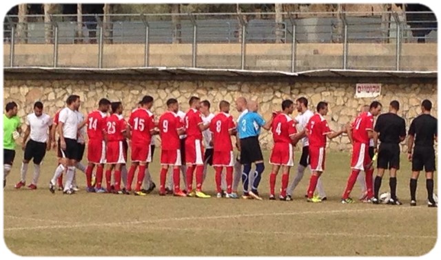 שחקני שתי הקבוצות לפני המשחק (צילום: עלאא בדארנה)