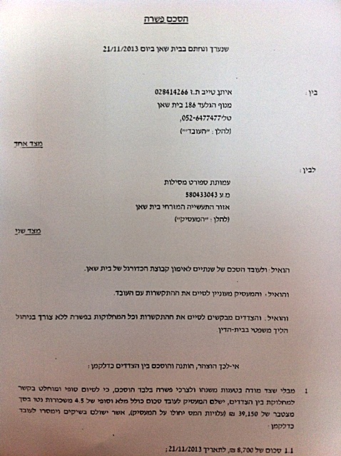 העתק מההסכם בין איתן טייב להפועל בית שאן.