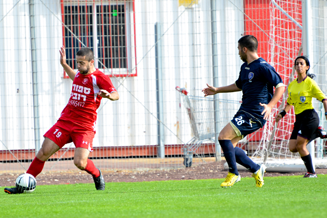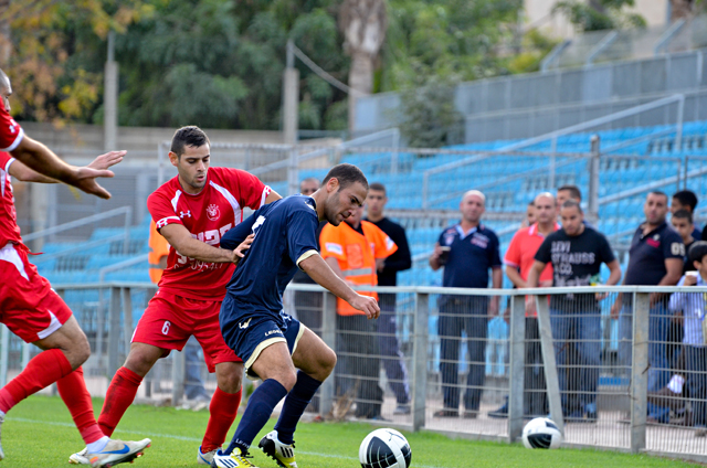 שי גבאי מס. 5 עם הגב חוסם את סאמח מרעב מכפר קאסם. (צילום: רמי גרידיש)