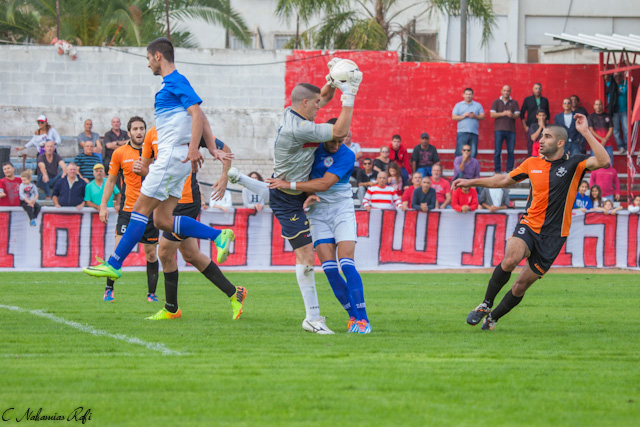 קומרקוב נוגח, קדוש הצליח להדוף .( צילום: רפי נחמיאס)