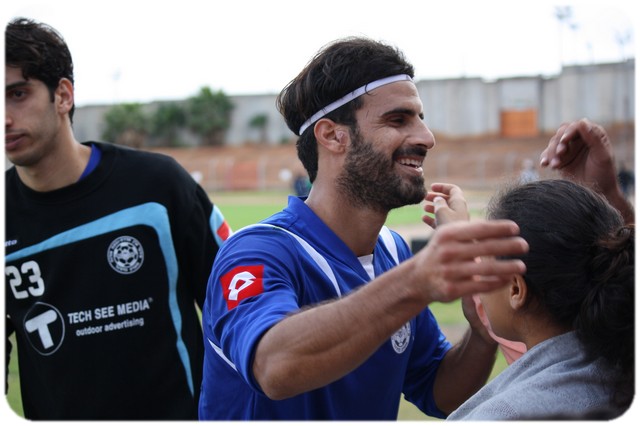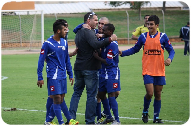 אדיר דנין מבסוט. בדש (כובש השער) מאחוריו (צילום: אילן מלאכי)