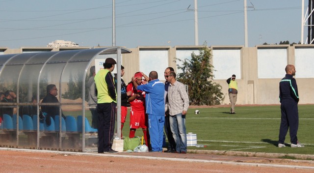 דקה 12: אורן בן לוי נפגע בראשו, יצא מחוץ לתחומי המגרש לקבל טיפול, נחבש בראשו וחזר.
