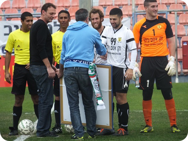 ברקוביץ מקבל מידיי נציג "11 הנסיכים", טל מלצר את השי. (צילום: אביחי חיים)