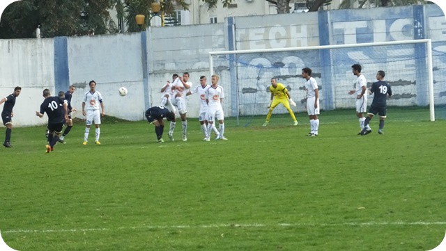 עידן סרור שולח את הכדור למסגרת. (צילום: אביחי חיים)