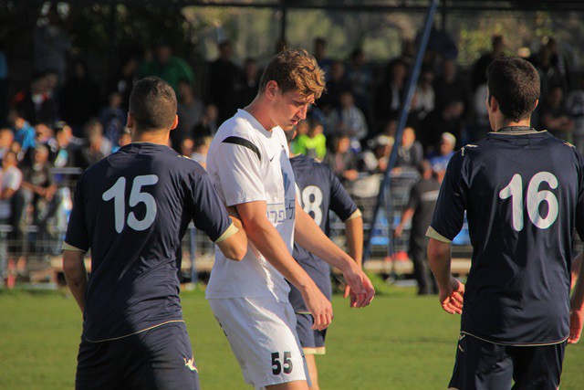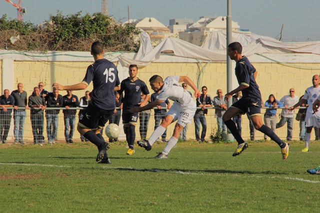 אלירן שערי משחרר בעיטה והכדור הולך הישר אל בין החיבורים (צילום: איתמר מורז)
