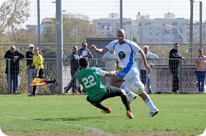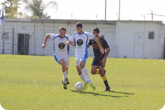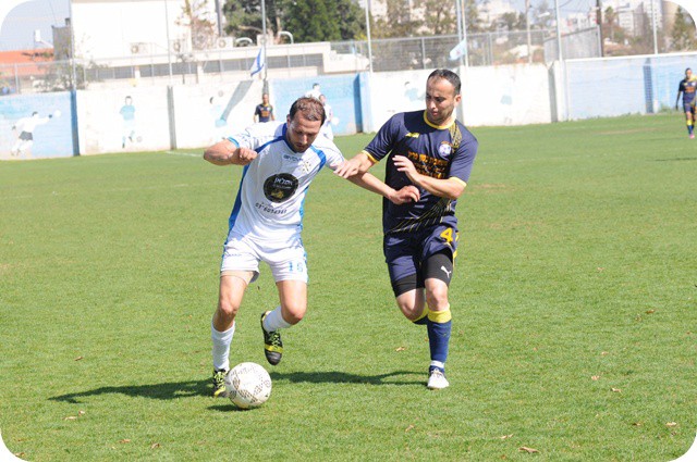 יעקב משה עם הכדור. מורדי פינטו מקרית אונו מבצע "עקיפה" כדי לקבל את הכדור..(צילום: איתן ידגר)