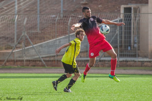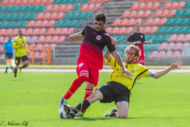 אור אלקבץ סוגר את אלעד כהן. כהן יכל להכפיל את התוצאה.( צילום:רפי נחמיאס)