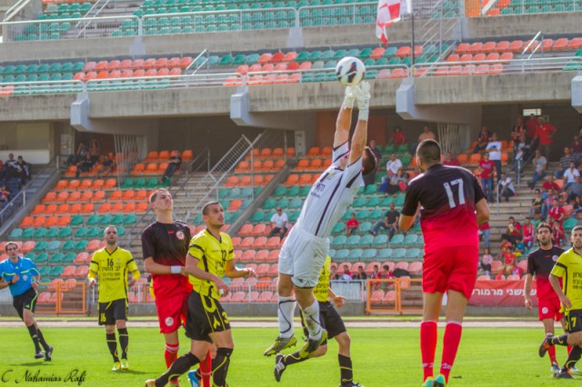 רן קדוש ראשון לכדור גובה. היה מחוסר עבודה במשחק.( צילום:רפי נחמיאס)