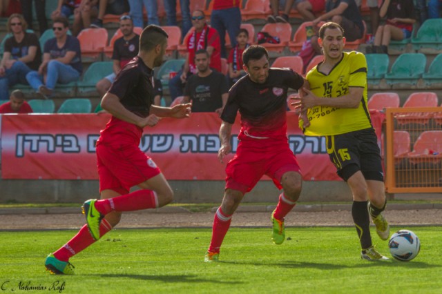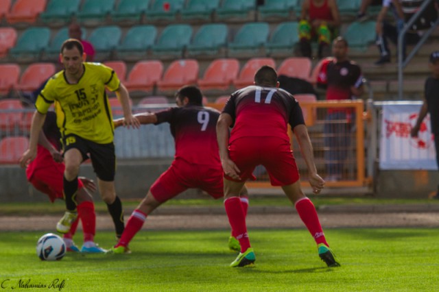 דניאל בורחל גובר על 3 שחקני מרמורק. סיפור המשחק.( צילום:רפי נחמיאס)