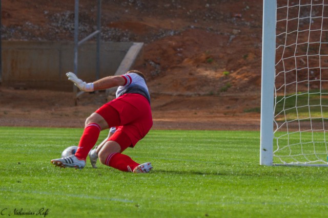 טום גלברט הודף את הפנדל של אפי אלון. במהלך ההדיפה נפצע בזרת. רפואה שלמה! ( צילום: רפי נחמיאס)