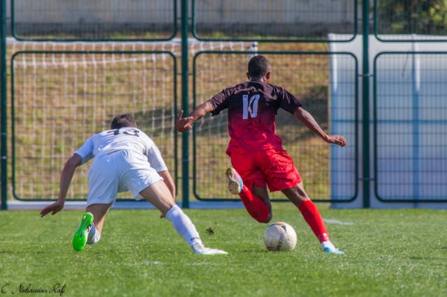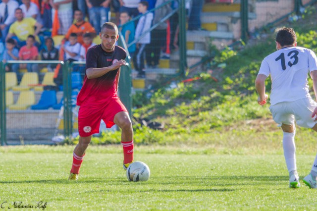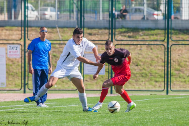 טל איילה משאיר מאחור את מגן מלאכי. משחק מצוין של הקשר .( צילום:רפי נחמיאס)