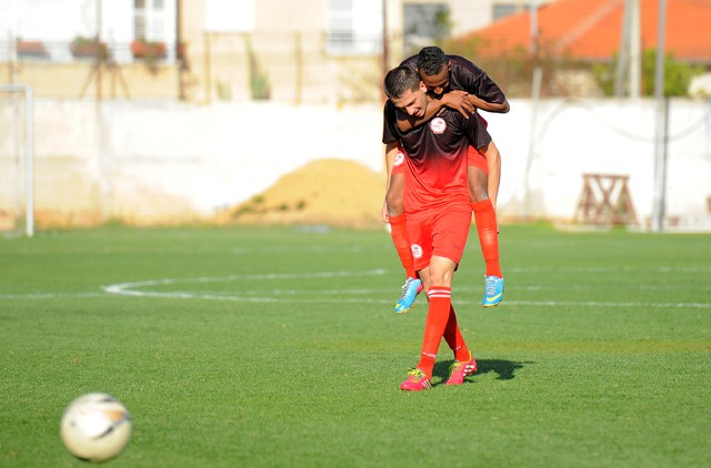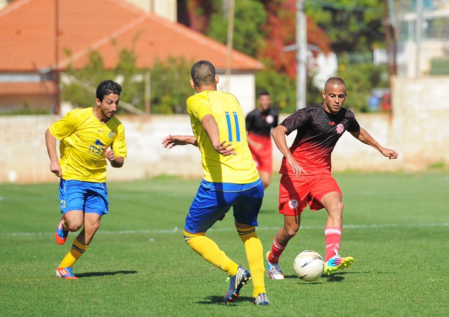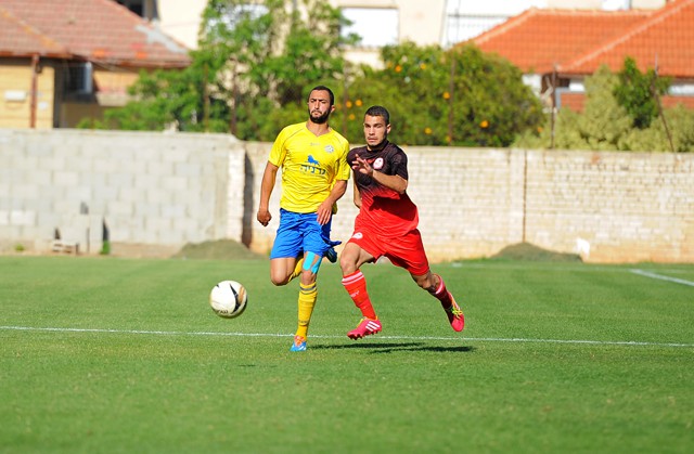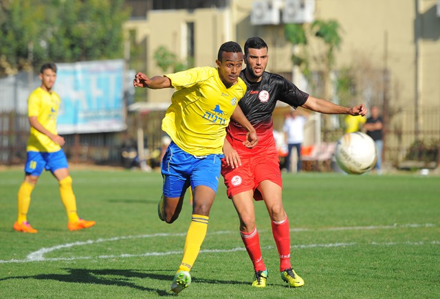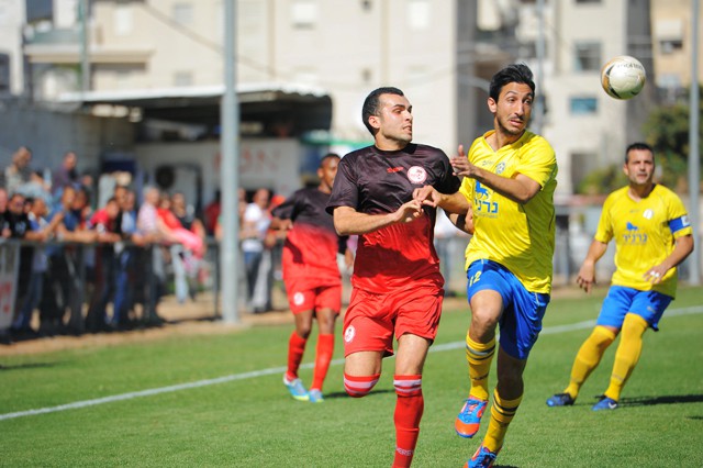 אור אלקבץ וחגי יצחק במרוץ אל הכדור. ( צילום:רמי גרידיש)