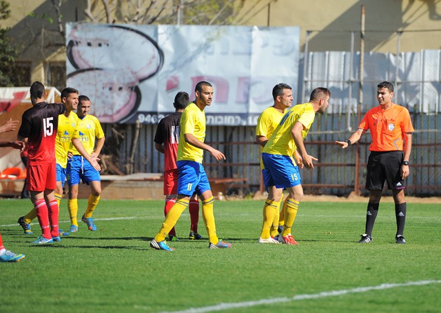 דור סבן וניר חזות באים בטענות לעברו של השופט דור ג'ואריס על שריקתו לפנדל. ( צילום:רמי גרידיש)