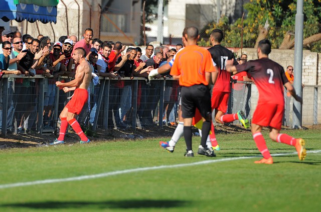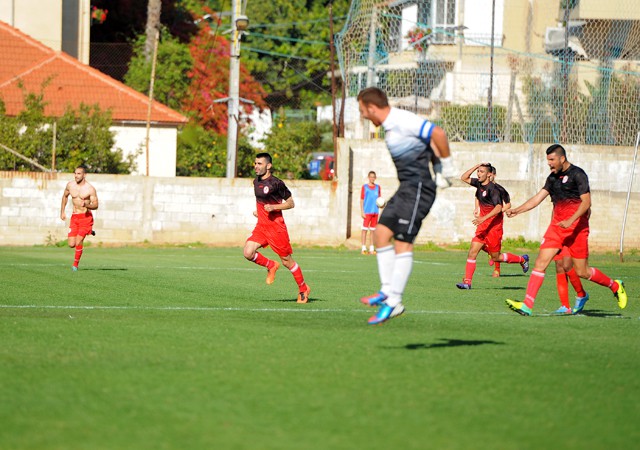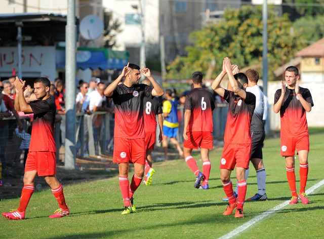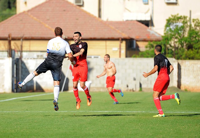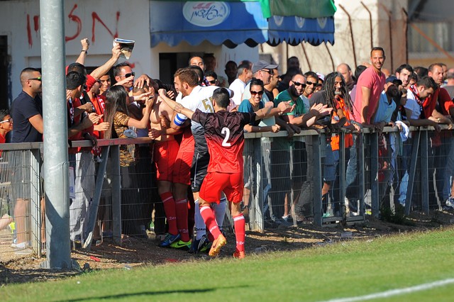 חגיגה של שחקני מרמורק לאחר כיבוש השער הנהדר של מוטי מלכה. ( צילום:רמי גרידיש)
