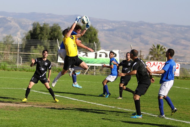 גיא סלמה שוערה של נהריה מעל טום דן. ( צילום: ירון כהן)